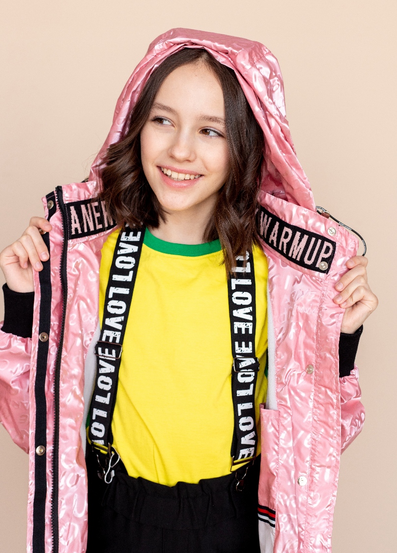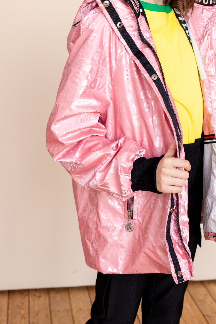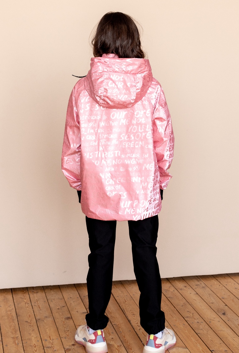Ветровка для девочки выполнена из перламутровой ткани. Капюшон отстегивается, на рукавах манжеты.