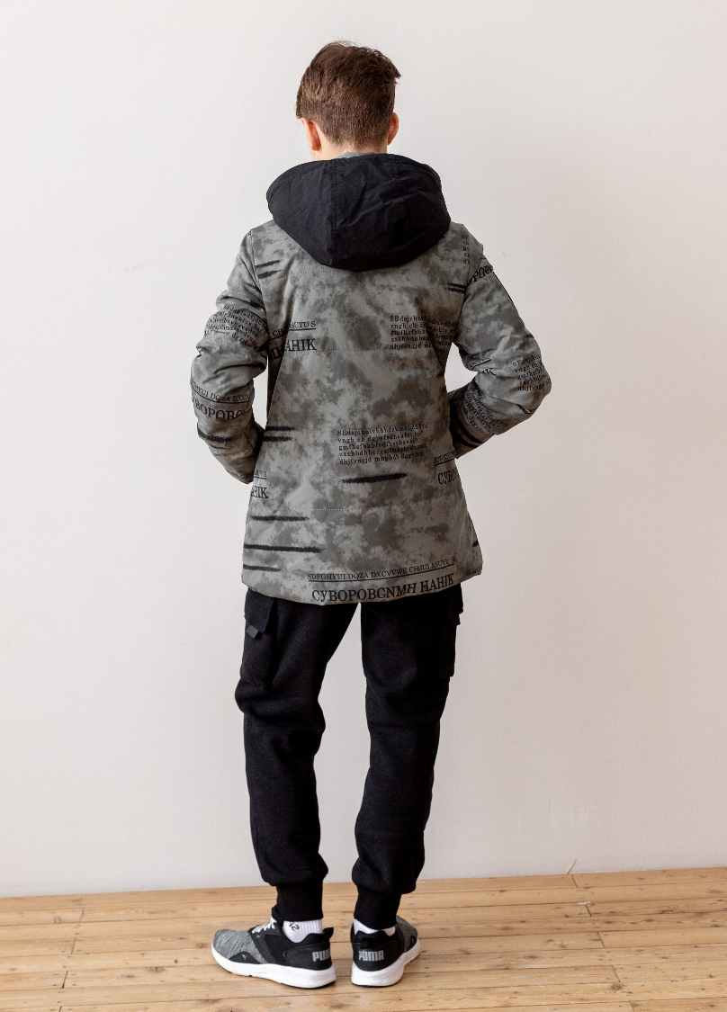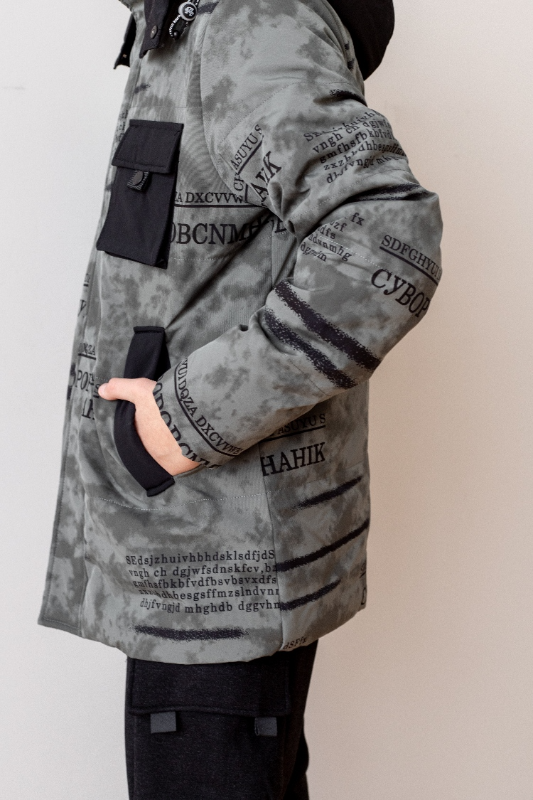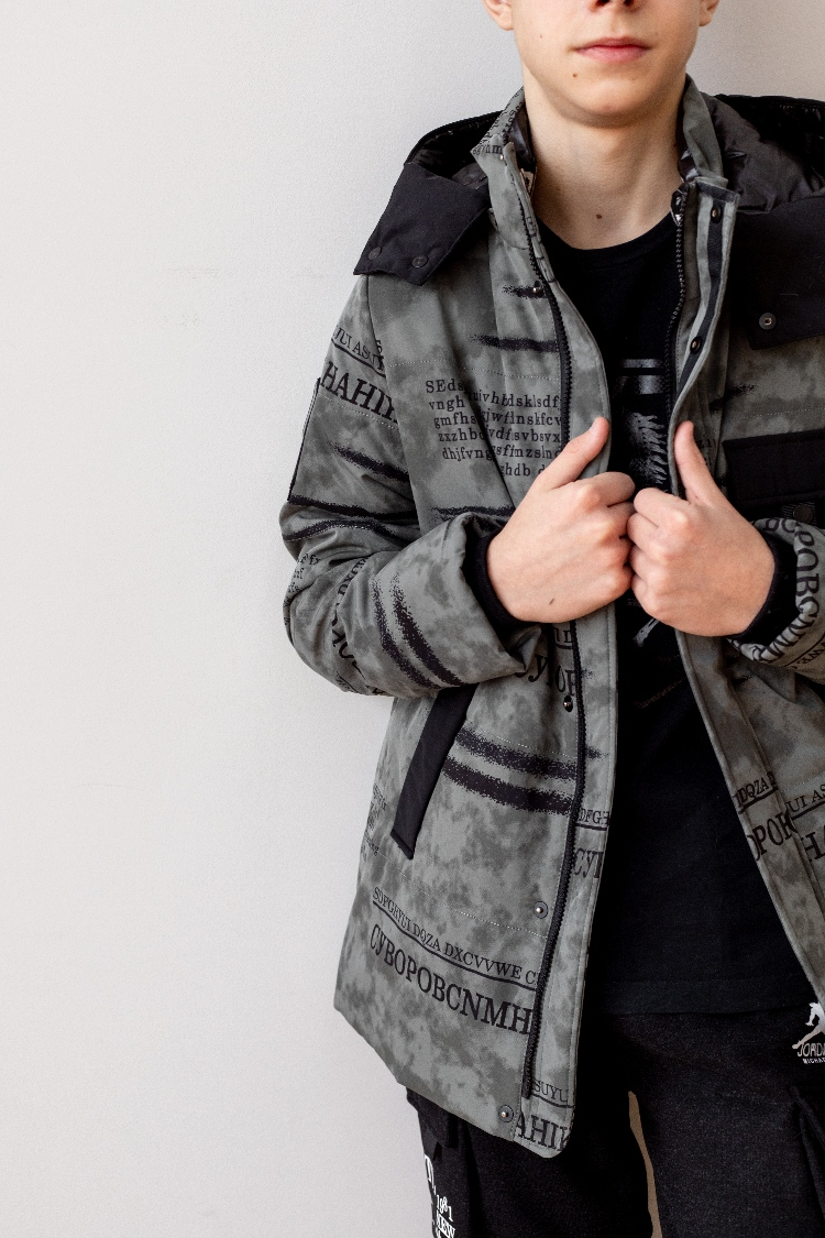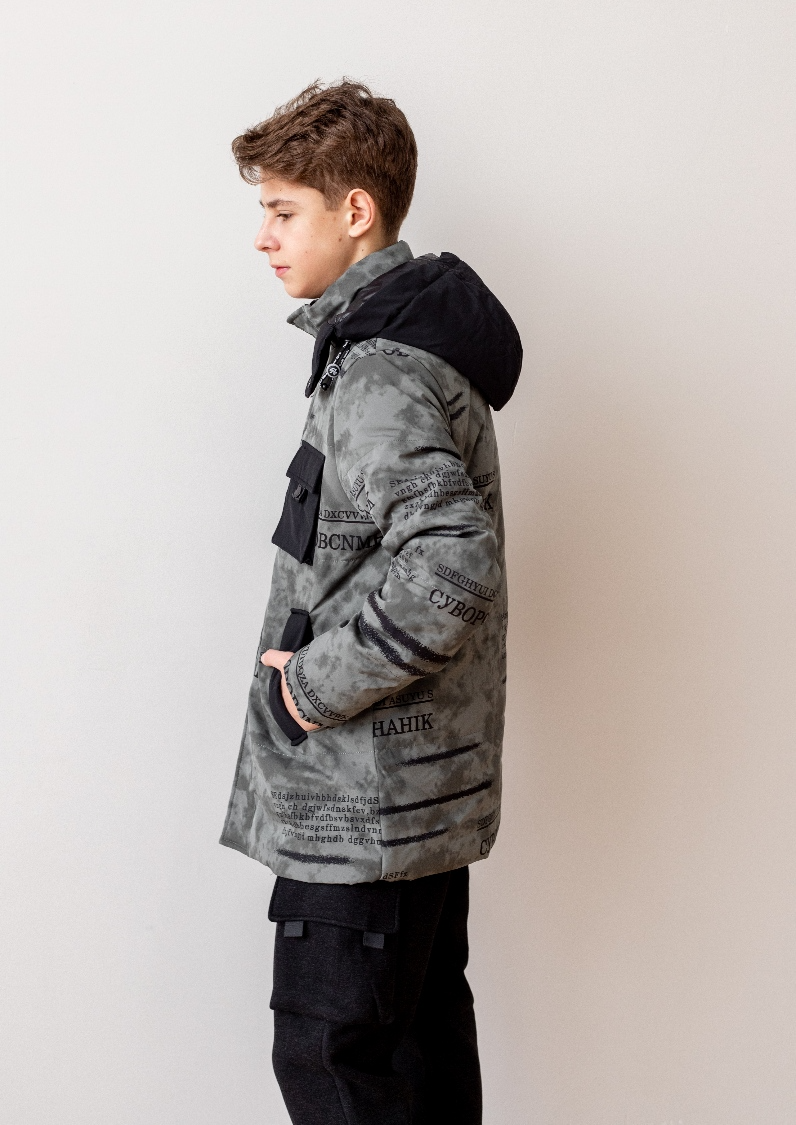 Куртка из плотной светоотражающей ткани. Капюшон отстегивается, в рукавах имеются манжеты.