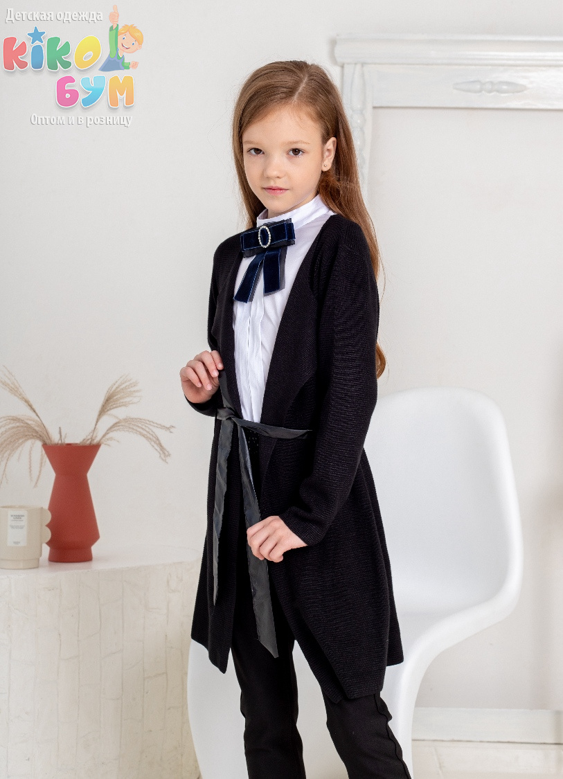 Кардиган для девочки удлиненный с длинным рукавом и съемным поясом из эко-кожи.
